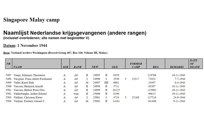 Frans Albert Ferdinand (Boeng) Vacquier was Nederland krijgsgevangene op 7 juli 1944 Singapore Malay camp.